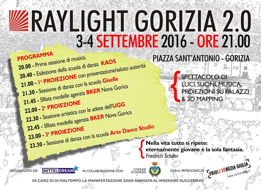 Il 3 e il 4 settembre, ritorna lo show multimediale “Raylight 2.0”. Dopo il successo ottenuto nel 2014 in Piazza Vittoria, l’associazione MITTELDREAM, ripropone le performance tridimensionali in piazza Sant’Antonio a Gorizia.